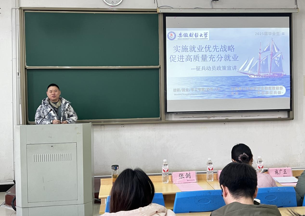 此次宣讲中,张剑老师围绕“实施就业优先战略,促进高质量充分就业”的主题,详细介绍了大学生参军入伍流程,蚌埠市禹会区及学校对参军入伍大学生的优惠政策,分享了许多参军入伍同学的真实案例,号召同学们厚植爱国情怀,树立报国之志,携笔从戎,筑梦军营。退役复学学生施广正同学现身说法,分享军营故事,吸引更多学生主动了解军营,投身军营。