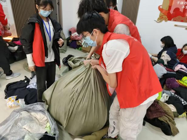 面对堆积如山的捐赠衣物,志愿者们迅速进入状态,按照“冬季的,干净整洁的,适合学生的”标准逐一挑选,大家在衣物间忙碌穿梭,不一会儿,符合要求的衣物就整齐地分类好。筛选完毕后,女生展现出了非凡的细心与耐心,将衣物一件件抚平、叠好,男生则接过接力棒,负责将衣物封箱,装进麻袋。