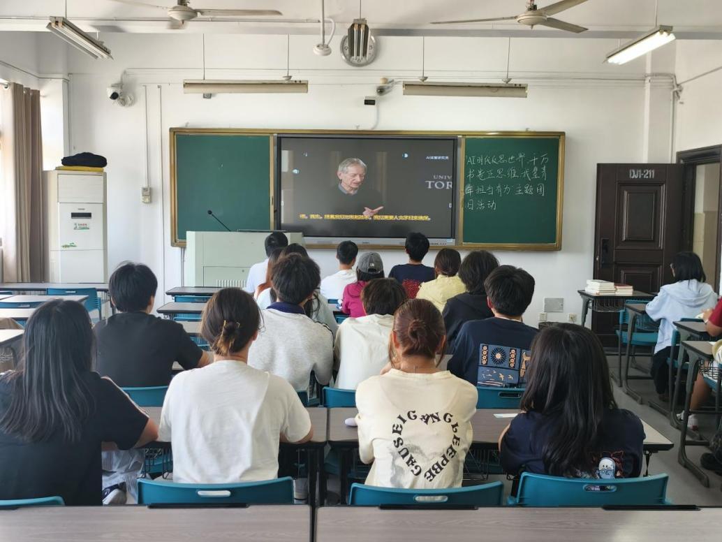 活动开始前,同学们共同观看视频——诺贝尔物理学奖得主、“人工智能之父”Geoffrey Hinton在多伦多大学本科新生讲座《你以为在追AI,其实你落下的是思考力》。演讲中,Hinton率先提出了一个重要观点:AI并没有越来越强,它只会预测,但不懂理解,我们要先重新理解我们自己的“理解”,未来真正留下的不是会用AI的人,而是会用AI重新做人类的人。随后Hinton分别从AI、个人、社会三个层面分析了当代生活焦虑背后“人类价值”的错位。现场同学在长达一小时的时间里,感受Hinton的智慧,观看结束后同学们争先恐后发表自己的看法,现场讨论热烈。