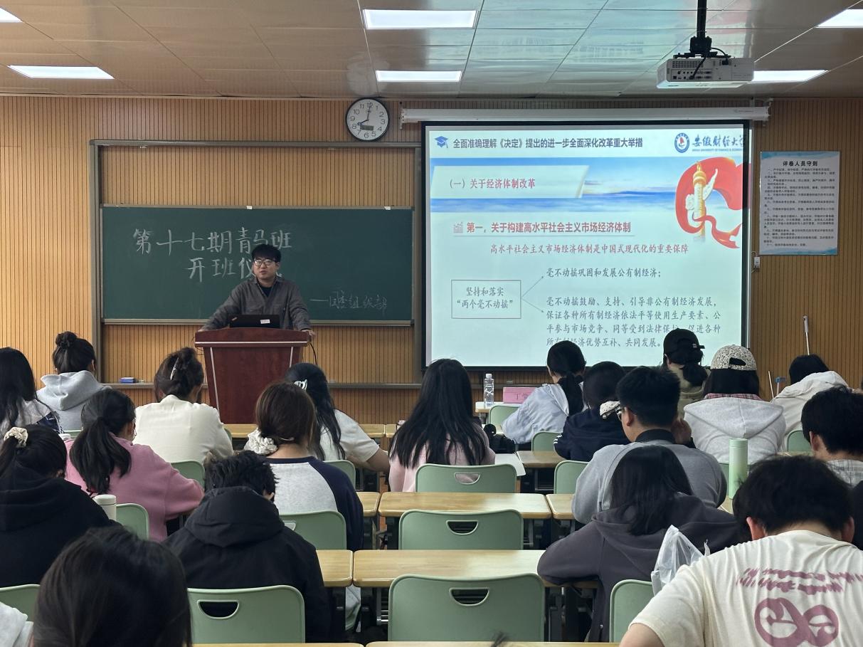 开班仪式结束后,马克思主义学院胡可可老师讲授开班第一课,聚焦党的二十届三中全会精神解读。课程以“1个主题主线、2大战略基点、3项制度创新、4大攻坚领域”为框架,系统解析全面深化改革部署。通过“新质生产力培育”“乡村振兴青年行动”等案例教学,引导学员建立“政策研读-问题分析-实践应用”学习闭环。