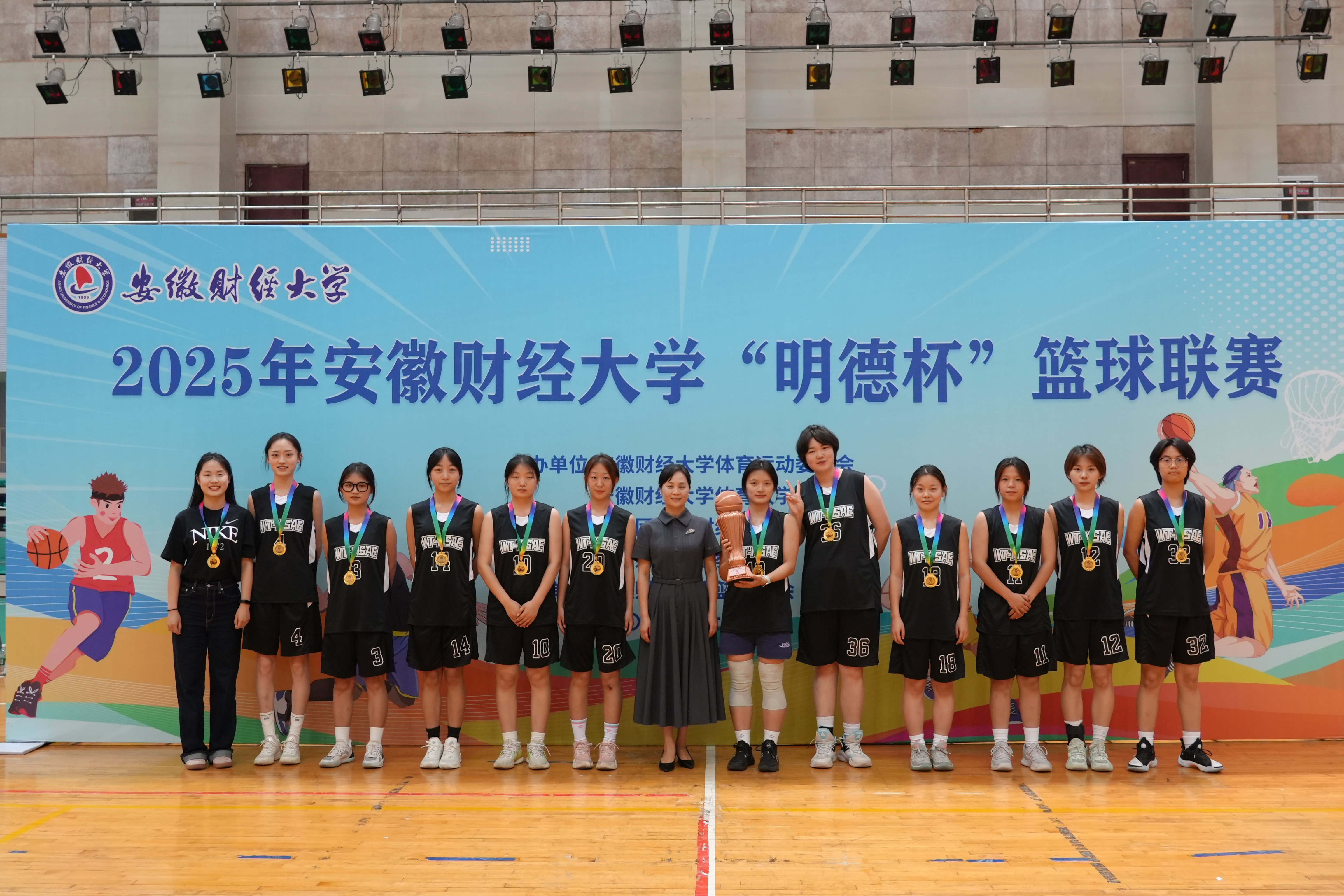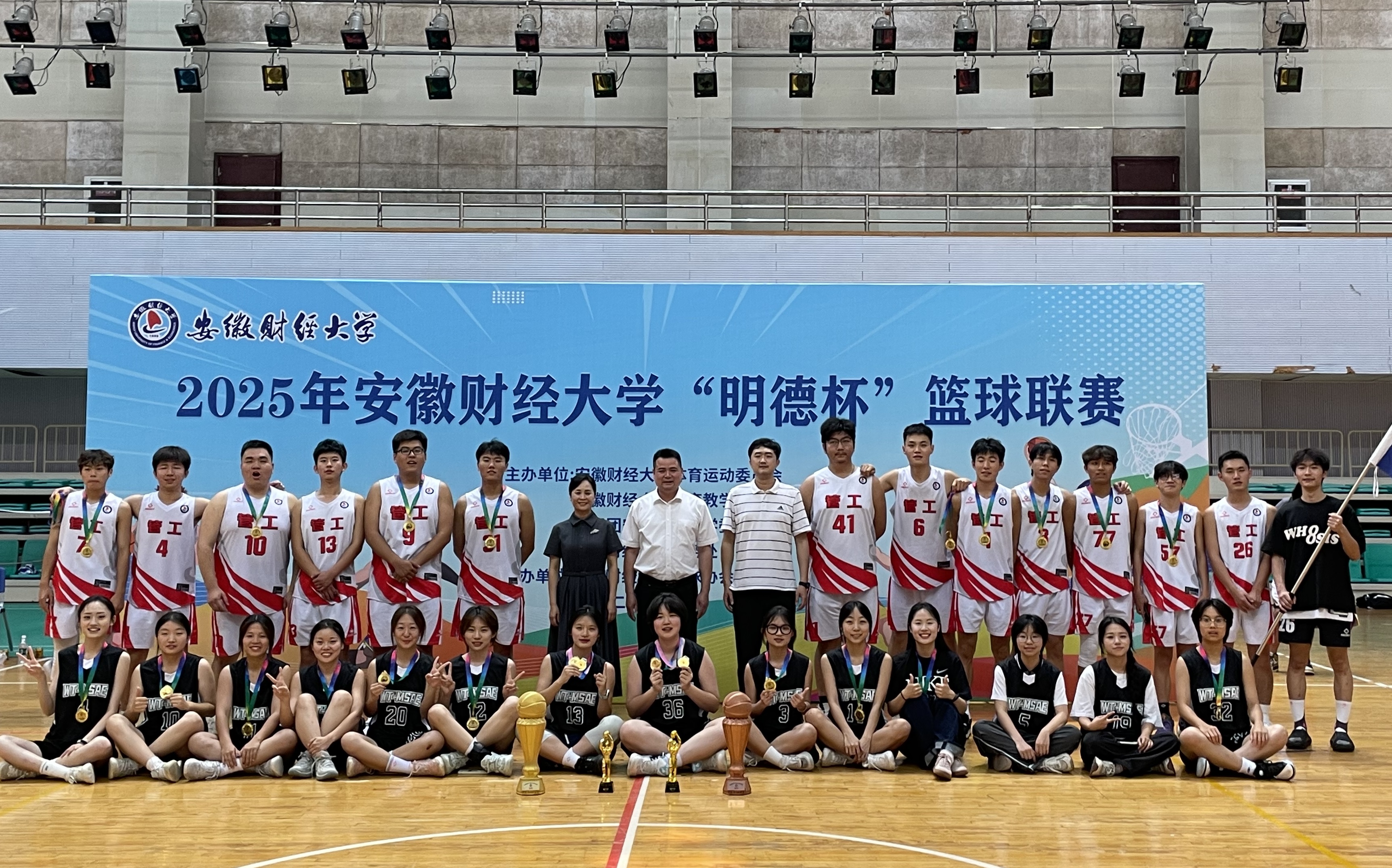 6月4日下午,2025年安徽财经大学“明德杯”篮球联赛决赛在龙湖东校区体育馆激情上演。经过激烈角逐,我院篮球队展现强大实力与顽强意志,女篮以38:13力克国际经济与贸易学院,男篮则以51:48险胜金融学院,成功卫冕本届赛事男、女篮双项冠军!这是我院篮球健儿们书写的又一辉煌篇章!