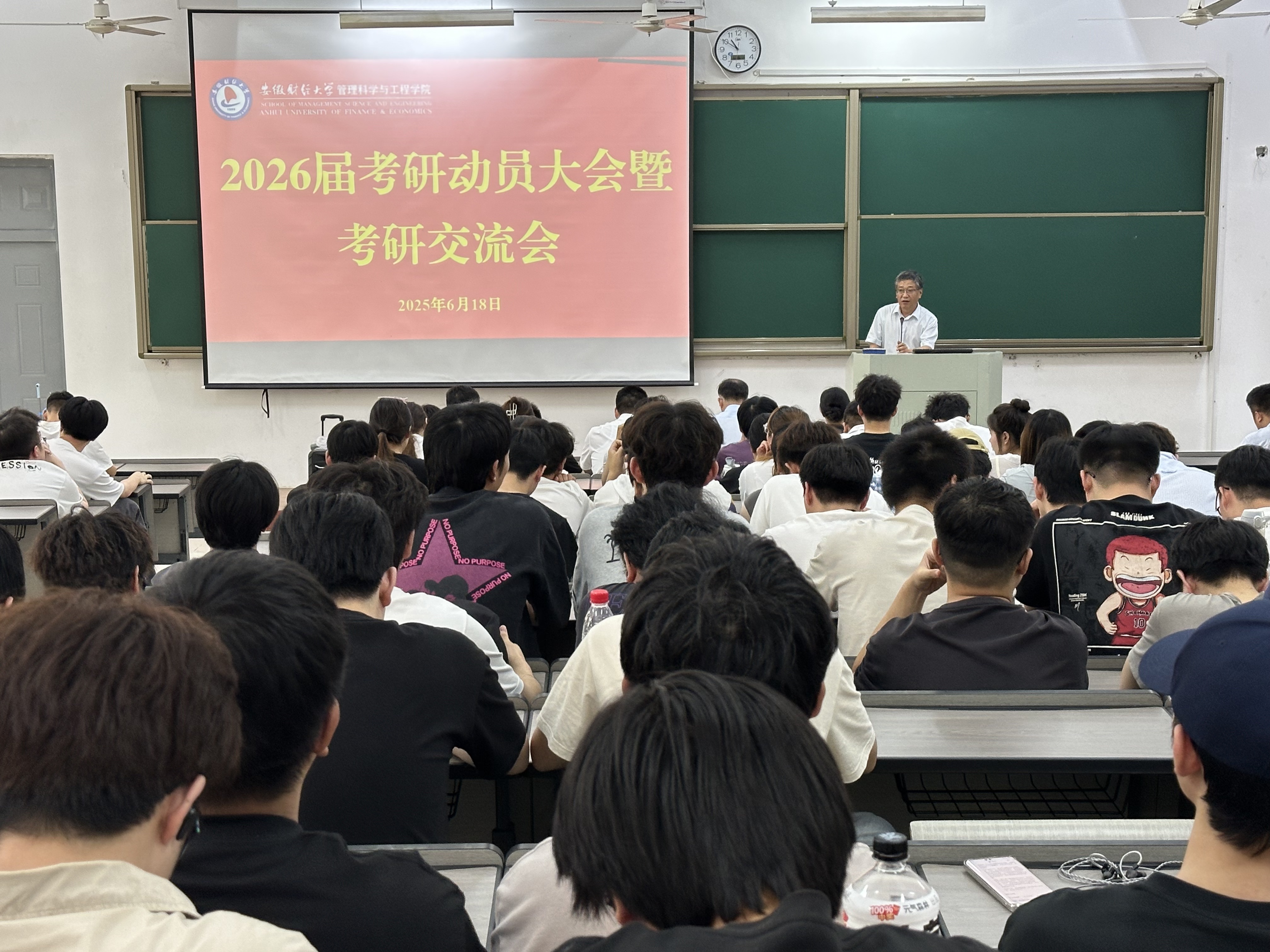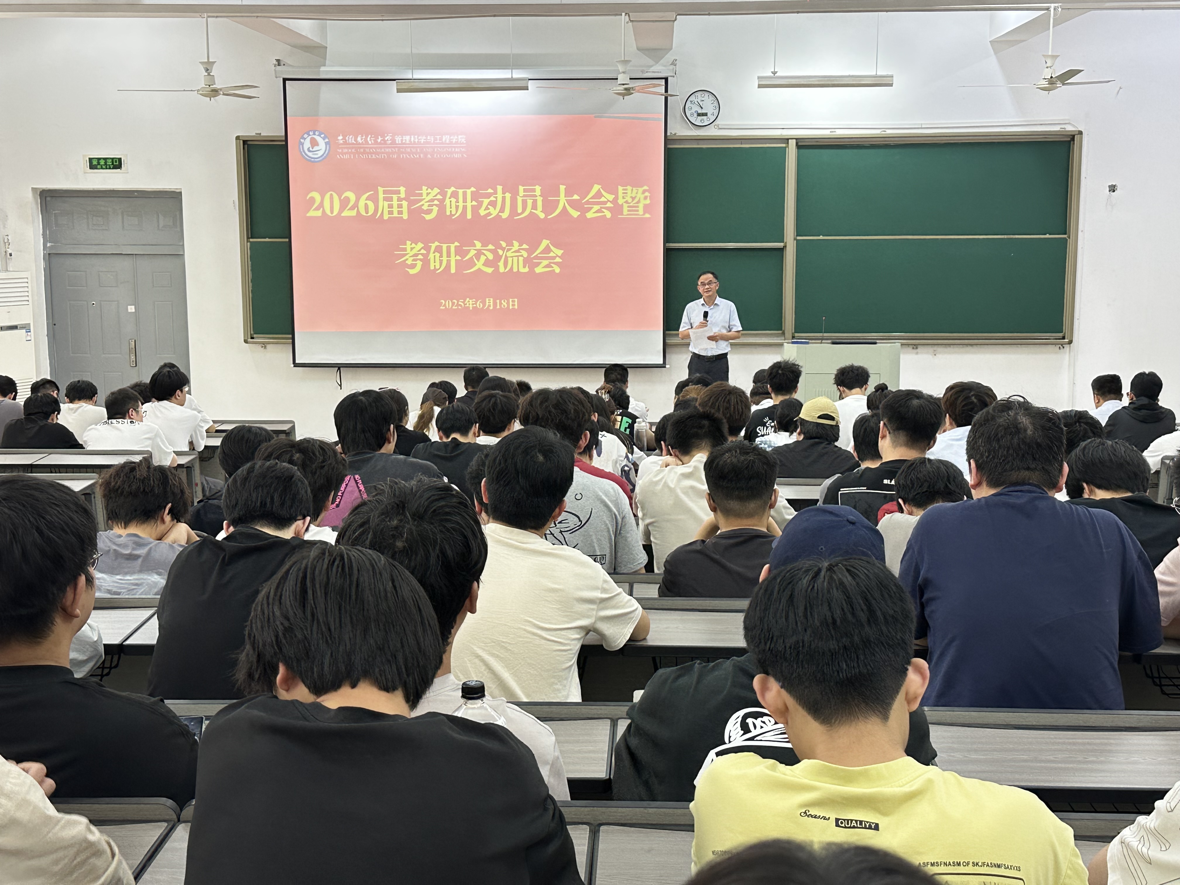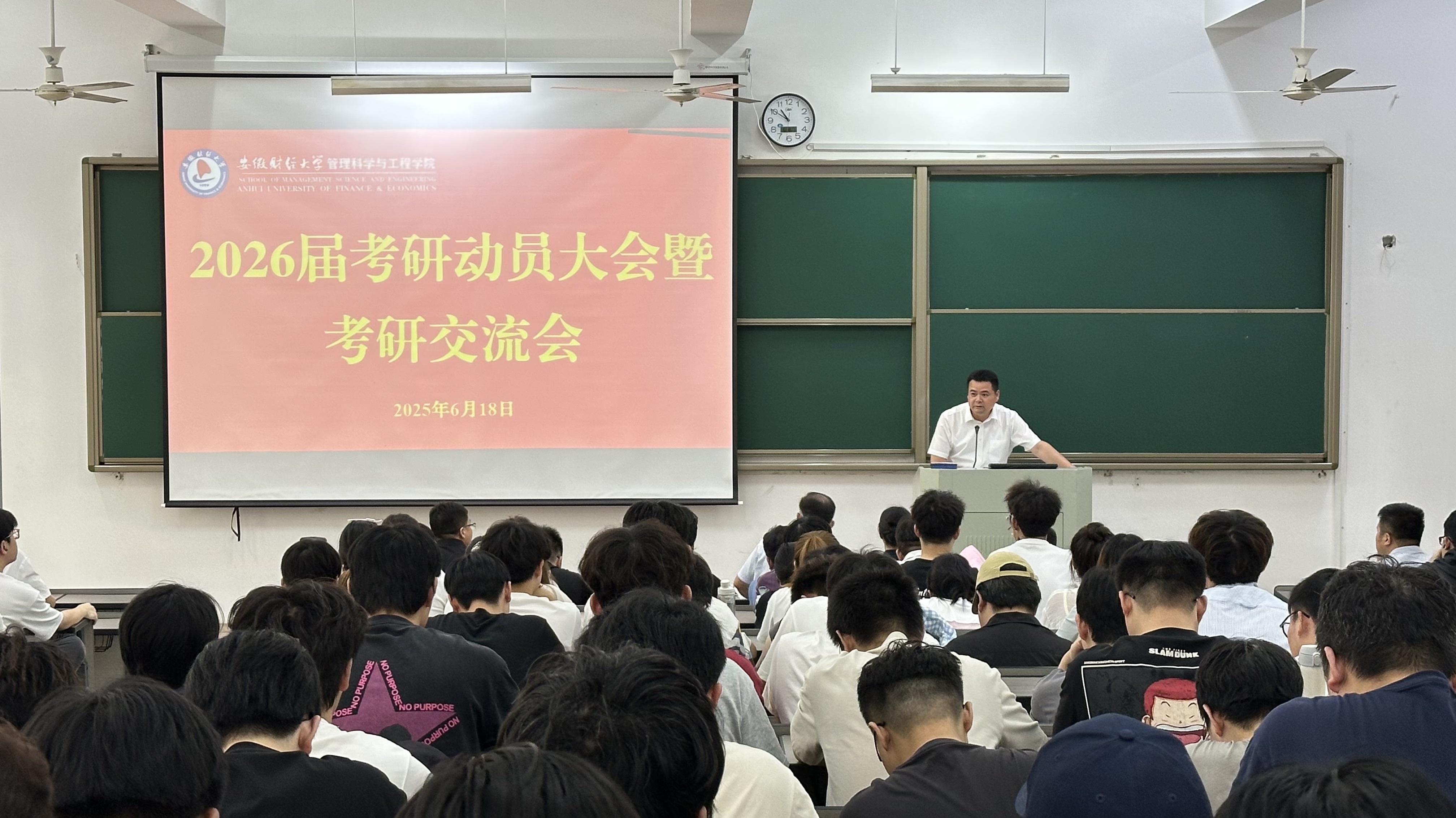 为激发考研热情,提供精准指导,助力2026届本科生科学规划考研之路,学院于6月18日在广学楼101教室隆重举行考研动员大会暨考研交流会。学院领导班子成员、系部负责人、教师代表、毕业班辅导员及全体2026届本科生参会。会议由副院长魏瑞斌主持。