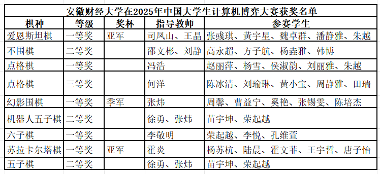 我校从省赛获奖队伍中遴选出11支队伍参赛,在8个棋类项目中展现了出色的技术实力,其中爱恩斯坦棋、幻影围棋、苏拉卡尔塔棋、点格棋、六子棋等项目斩获一等奖;不围棋、五子棋、机器人五子棋等项目荣获二等奖;点格棋获得三等奖。这些成绩充分体现了安徽财经大学在计算机博弈领域的多点突破和全面发展。